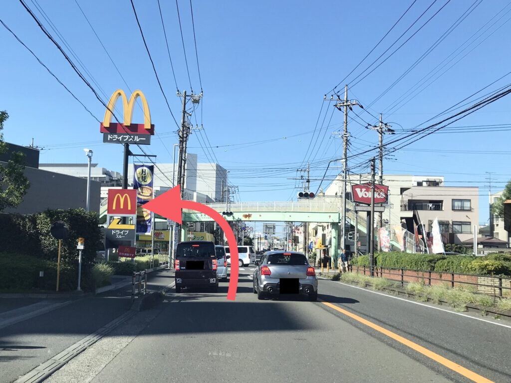 藤沢街道を藤沢方面から走行している場合、マクドナルドとVOLKSのある「深見歩道橋」交差点を左折します(町田方面から走行している場合は、同交差点を右折します)。